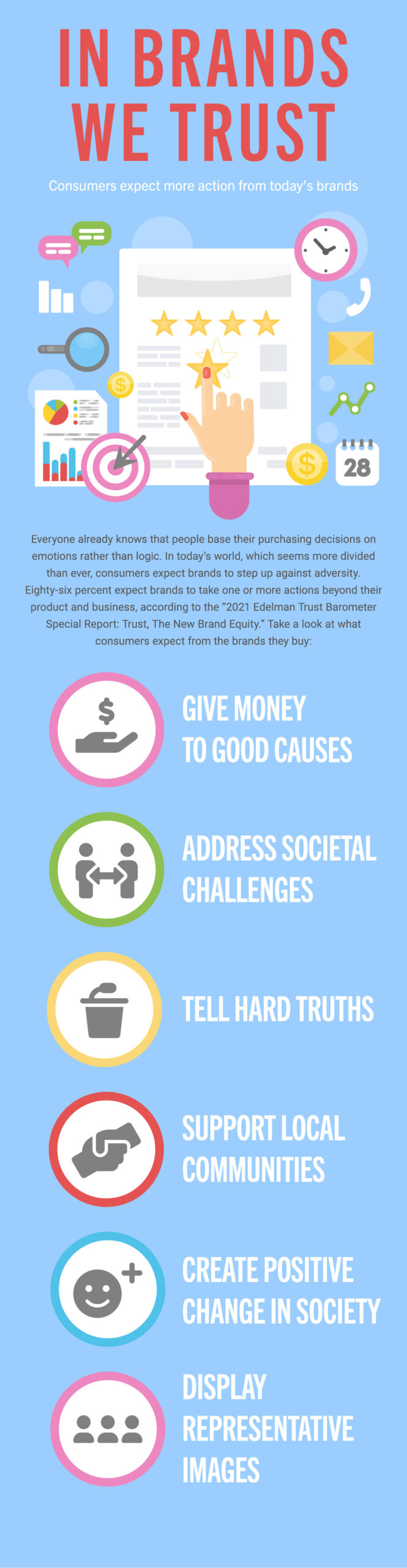 Everyone already knows that people base their purchasing decisions on emotions rather than logic. In today’s world, which seems more divided than ever, consumers expect brands to step up against adversity. Eighty-six percent expect brands to take one or more actions beyond their product and business, according to the “2021 Edelman Trust Barometer Special Report: Trust, The New Brand Equity.” Take a look at what consumers expect from the brands they buy: